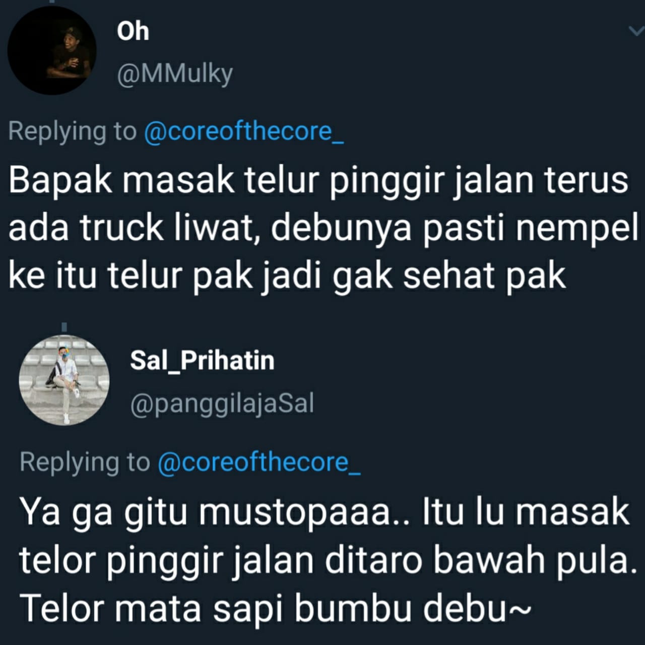 "Ya ga gitu mustopaaa.. Itu lu masak telor pinggir jalan ditaro bawah pula. Telor mata sapi bumbu debu~".