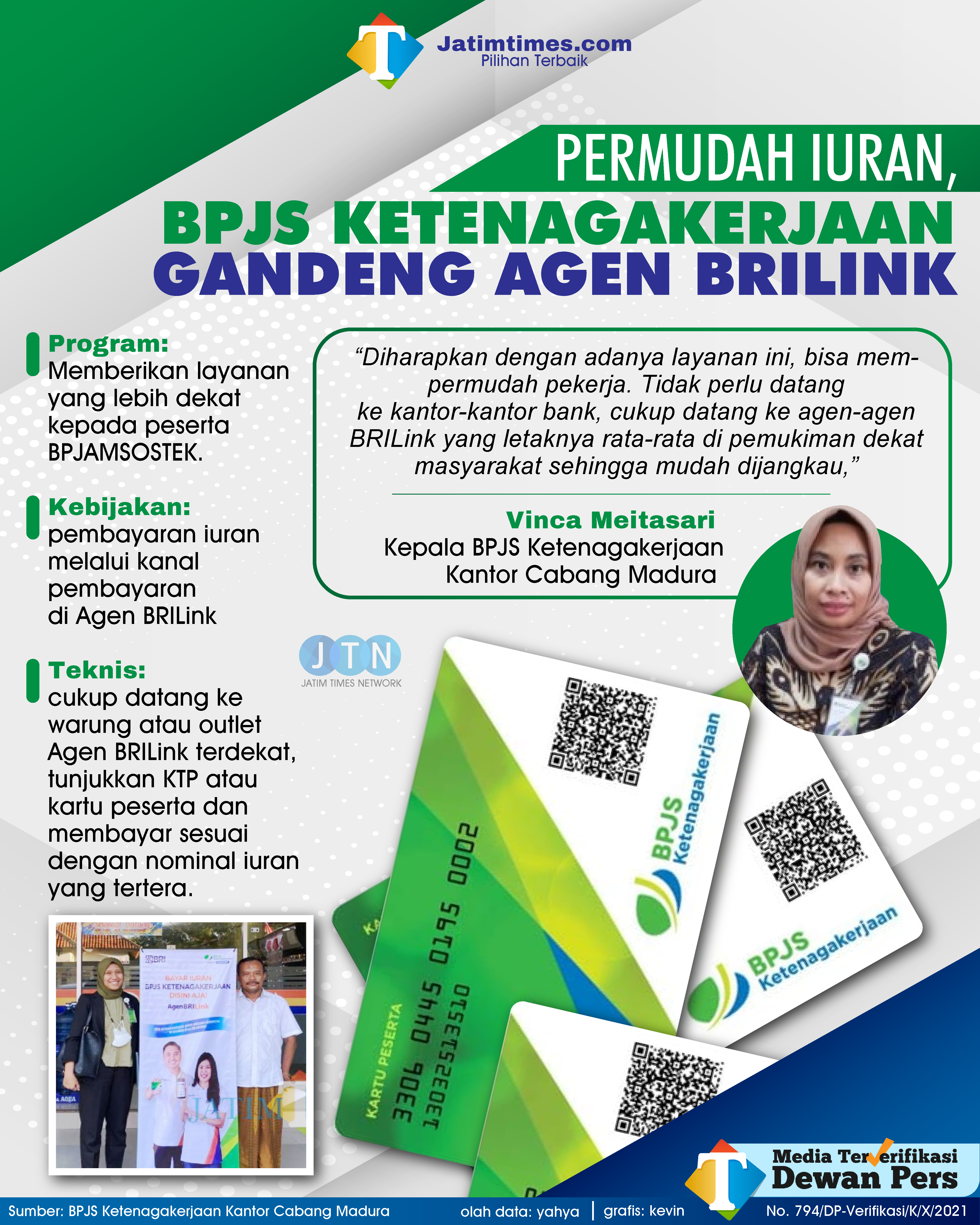 Kepala BPJS Ketenagakerjaan Kantor Cabang Madura, Vinca Meitasari menambahkan keterangan pembayaran iuran melalui agen BRILink sangat mudah. Untuk peserta Bukan Penerima Upah (BPU) cukup datang ke warung atau outlet Agen BRILink terdekat dengan menunjukkan KTP atau kartu peserta dan membayar sesuai dengan nominal iuran yang tertera.