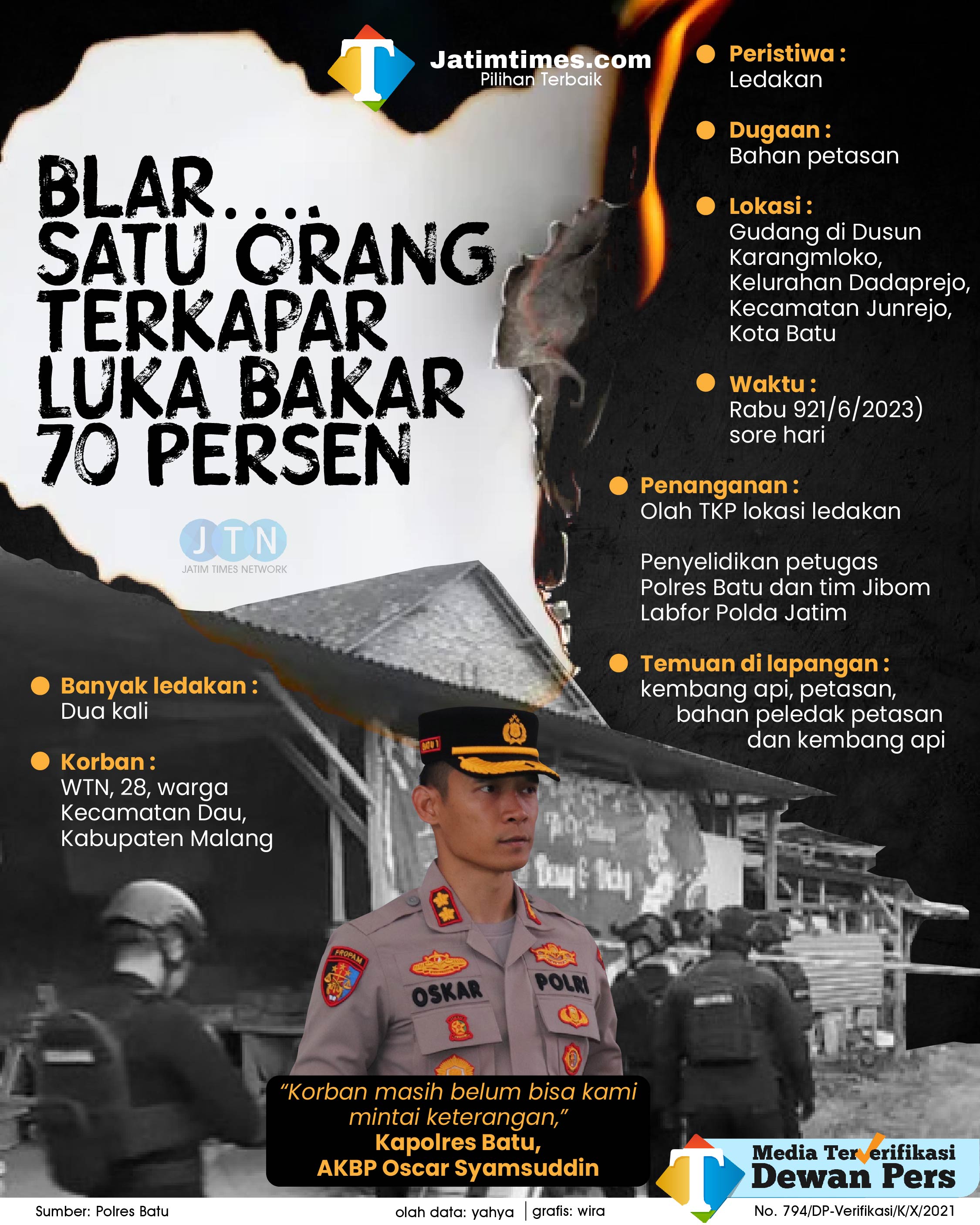 Kapolres Batu, AKBP Oscar Syamsuddin mengatakan, pihaknya masih melakukan penyelidikan terkait penyebab ledakan yang terjadi di Jalan Mawar tersebut. Akibat dari ledakan pada gudang, terdapat satu korban mengalami luka bakar.