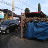 Karena terguling, muatan tebu yang dibawa terjatuh ke sisi barat jalan dan sebagian menimpuk kendaraan pickup putih yang parkir.