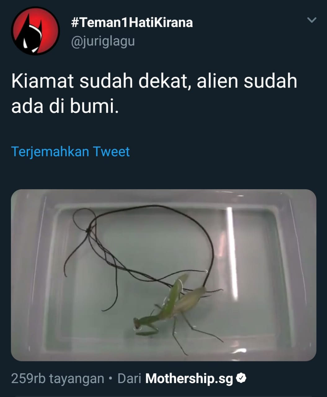 Makhluk tersebut keluar dari belalang hingga belalang tersebut lemas kemudian mati. Video aneh tersebut pertama kali diupload oleh akun @MothershipSG.