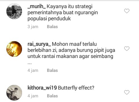 Warganet menuliskan doktrin untuk membantai burung sebagai strategi pemerintah mengurangi populasi warganya. Akun Rendyadinata725 menulis, "Mengurangi jumlah penduduknya tanpa mengotori tangannya,". Senada dengan akun Murih yang berkomentar seperti ini, "Kayanya itu strategi pemerintahnya buat ngurangi populasi penduduk,".