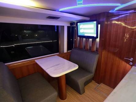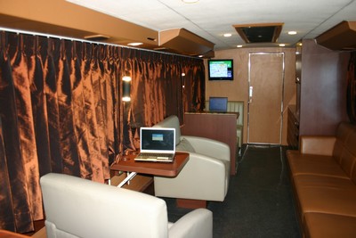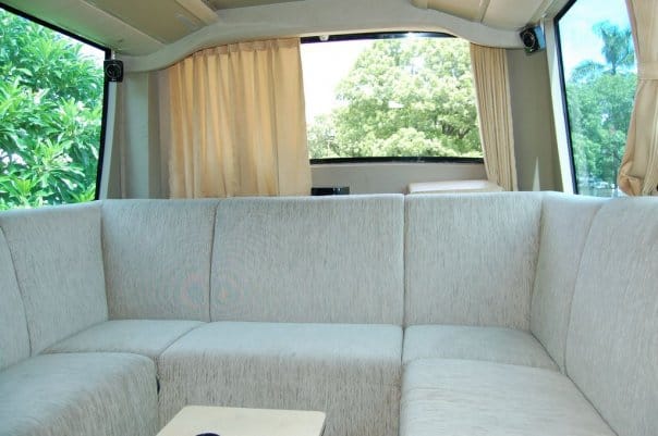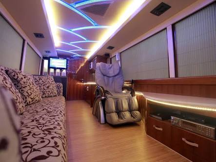 Di dalamnya, terdapat fasilitas yang sangat lengkap, yang terbagi menjadi tiga ruangan. Di ruang depan adalah tempat kemudi yang dipisahkan dengan sebuah pintu dengan ruang tengah. Sedangkan di ruang tengah, terdapat kursi sofa ukuran besar, kursi pijat elektrik, LCD TV 32 inchi dan DVD Player yang dilengkapi fasilitas karaoke. Selain itu, di ruang tersebut juga terdapat dapur kering yang dilengkapi dengan lemari es, microwave, pemanas air, dan pemanggang roti, serta meja dan kursi untuk makan.