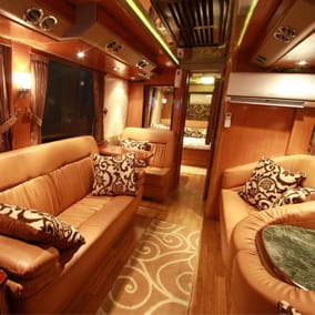 AMTrans Luxurious berinovasi menghadirkan kendaraan bus mewah berkonsep Caravan RV dengan berbagai fasilitas seperti sofa-sofa empuk menggantikan deretan tempat duduk dalam kendaraan, jadi tidak seperti duduk di dalam bus yang bejajar, lalu ada TV LED layar lebar dengan fasilitas HD multimedia player, digital karaoke sistem dengan layar touch screen, kursi pijat, lemari pakaian, lemari es, meja makan, tempat tidur, dan kamar mandi dengan shower yang berfungsi dengan baik.