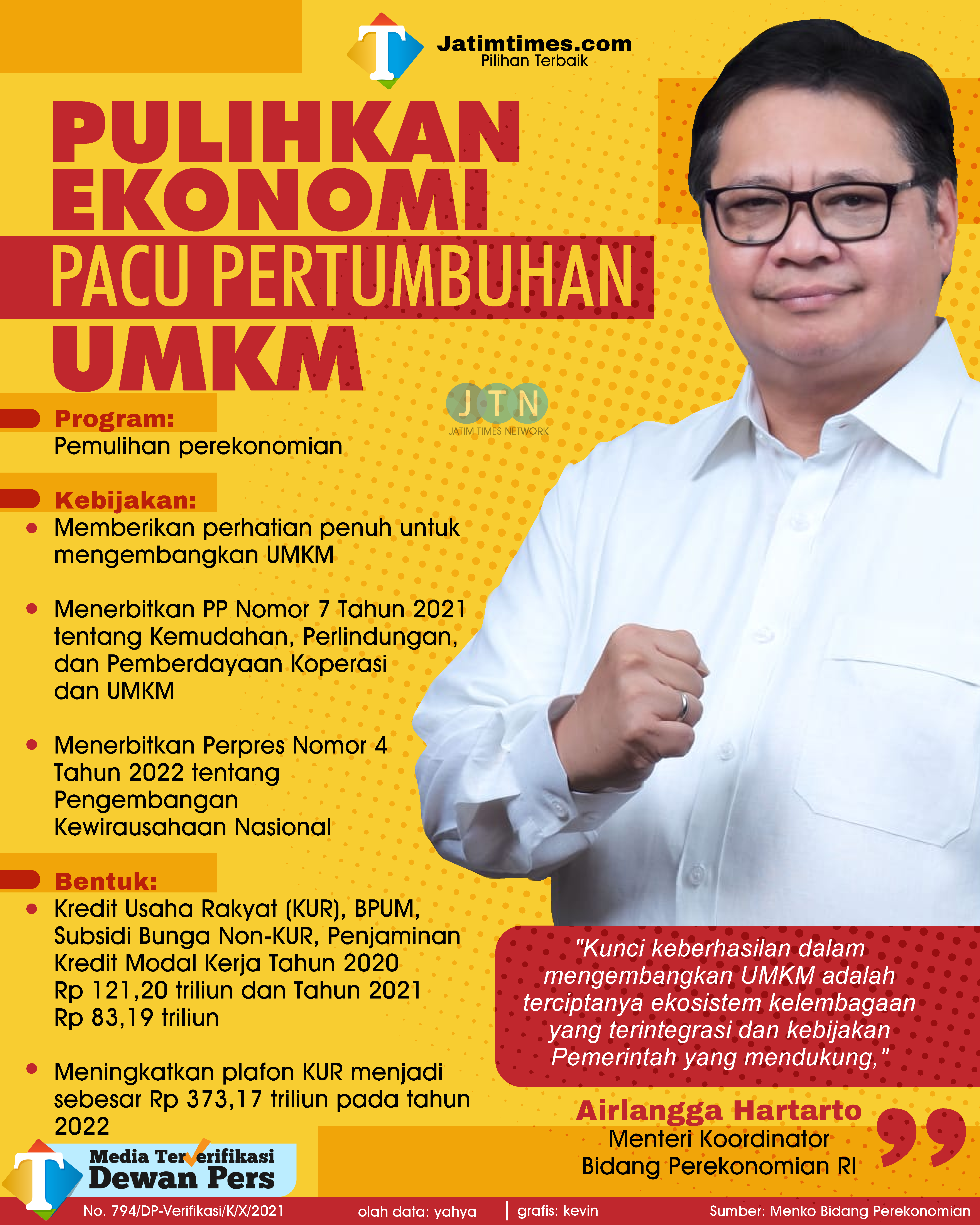 "Sehingga pemerintah mendorong program khusus pemulihan ekonomi nasional dengan mengalokasikan Rp 121,20 triliun pada 2020 dan Rp 83,19 triliun pada 2021 melalui Kredit Usaha Rakyat (KUR), BPUM, Subsidi Bunga Non-KUR, Penjaminan Kredit Modal Kerja, dan lainnya," ungkap Menko Airlangga saat menyampaikan Keynote Speech secara virtual dalam acara Webinar Keluarga Alumni Universitas Gajah Mada: Kontribusi UMKM untuk Pemulihan Ekonomi Nasional-Kolaborasi Multipihak dalam Pemberdayaan UMKM, Sabtu (6/8/2022).