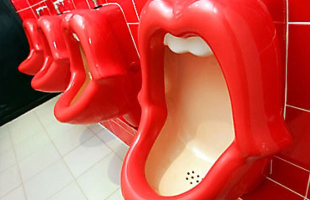 Sekilas mirip bibir yang dijadikan ikon grup band legendaris Rolling Stone. Berbentuk bibir dengan warna merah menyala, toilet ini siap untuk melahap kucuran air seni para lelaki. (*)