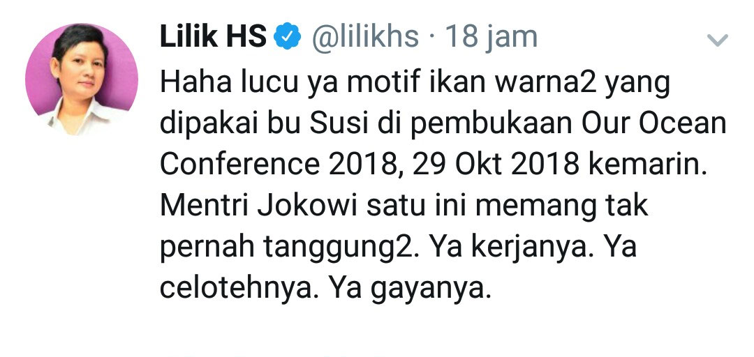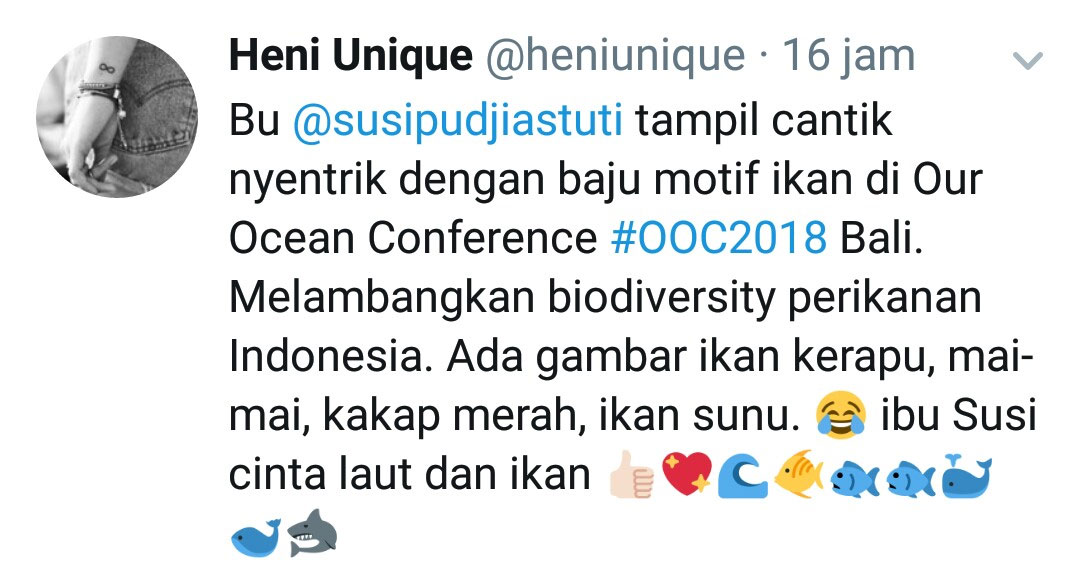 Namun, sebenarnya Susi memiliki gaya yang stylist dan nyentrik. Contohnya saat pembukaan Our Ocean Conference 2018 Senin lalu (29/10).