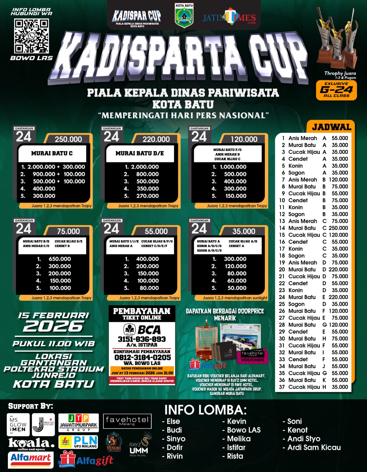 Untuk menjaga profesionalitas, panitia menetapkan sistem pemesanan tiket secara online melalui nomor WhatsApp 0812-3184-0205 (Bowo Jaya BC) dengan batas akhir pemesanan hingga Jumat, 13 Februari 2026.