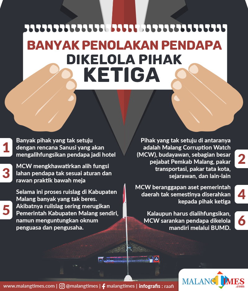 MALANGTIMES - Rencana alih fungsi Pendopo Agung Kabupaten Malang sebagai hotel dan penunjang wisata dinilai Malang Corruption Watch (MCW) sama sekali tak menyalahi aturan. Syaratnya, proses itu dijalankan dengan cara yang benar serta sesuai peraturan dan undang-undang.
