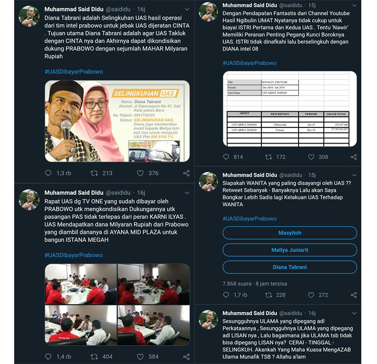 "Diana Tabrani adalah Selingkuhan UAS hasil operasi dari tim intel prabowo untuk jebak UAS dijeratan CINTA . Tujuan utama Diana Tabrani adalah agar UAS Takluk dengan CINTA nya dan Akhirnya dapat dikondisikan dukung PRABOWO dengan sejumlah MAHAR Milyaran Rupiah," tulisnya yang dilanjut rangkaian cuitan lainnya.