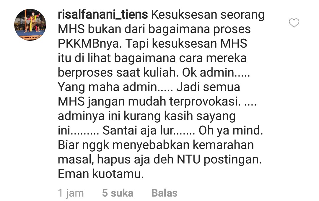Akun @drama.brawijaya mengunggah postingan sensitif yakni screenshot status WhatsApp yang bertuliskan, "Ngeliat PKKMU UB, mabanya sholat jamaah dan pecahin rekor MURI Perkusi. Terus ngeliat PKKMB UM mabanya diajakin konser. Ko rasanya nganu sekali ya. Treatment di awalnya aja udah beda kelas. Ya pantes kalau output-nya juga beda kualitas."