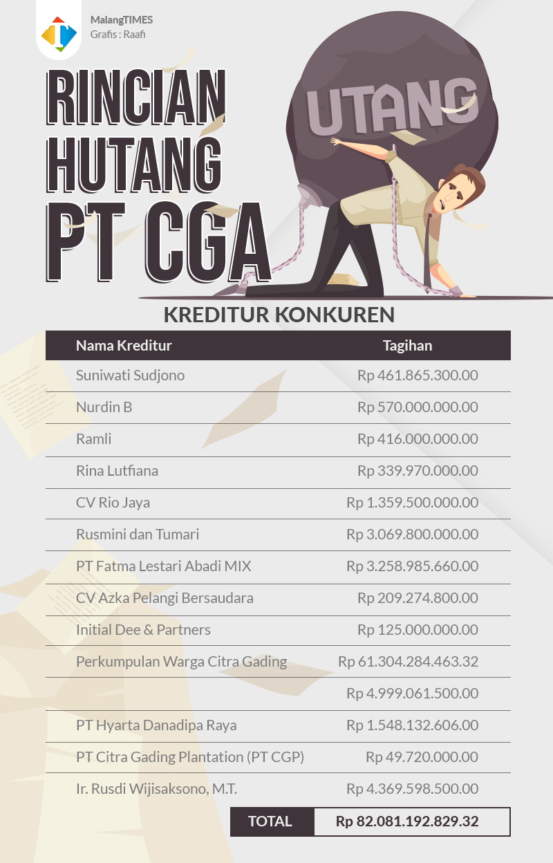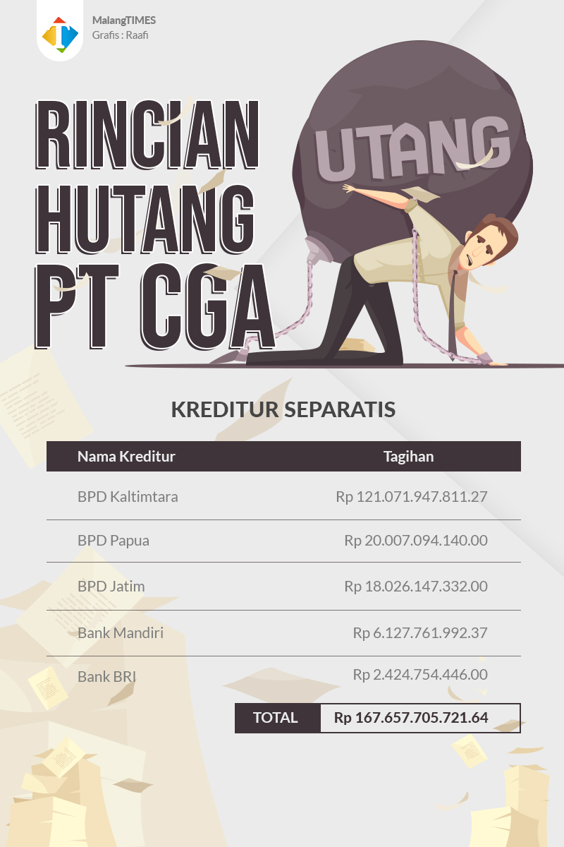 Berdasarkan data yang didapat dari pengurus PKPU (penundaan kewajiban pembayaran utang), jumlah utang PT CGA totalnya adalah Rp 249.738.898.550. Jumlah utang itu terbagi kepada dua kreditur. Yakni kreditur konkuren dan kreditur separatis.