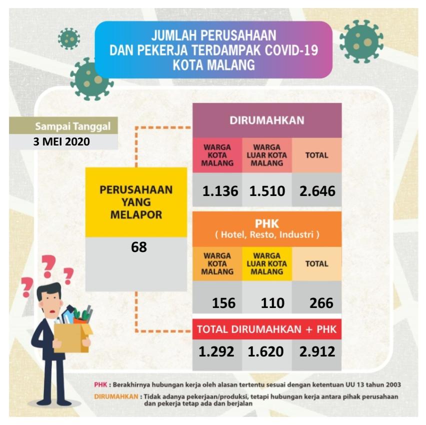 Sementara itu, Kepala Disnaker-PMPTSP Kota Malang, Erik Setyo Santoso ST, MT menyampaikan, hingga 3 Mei 2020 tercatat ada 2.912 pekerja yang dirumahkan dan di PHK. Jumlah tersebjmut meliputi pekerja yang berasal dari Kota Malang dan warga yang ber-KTP luar Kota Malang.