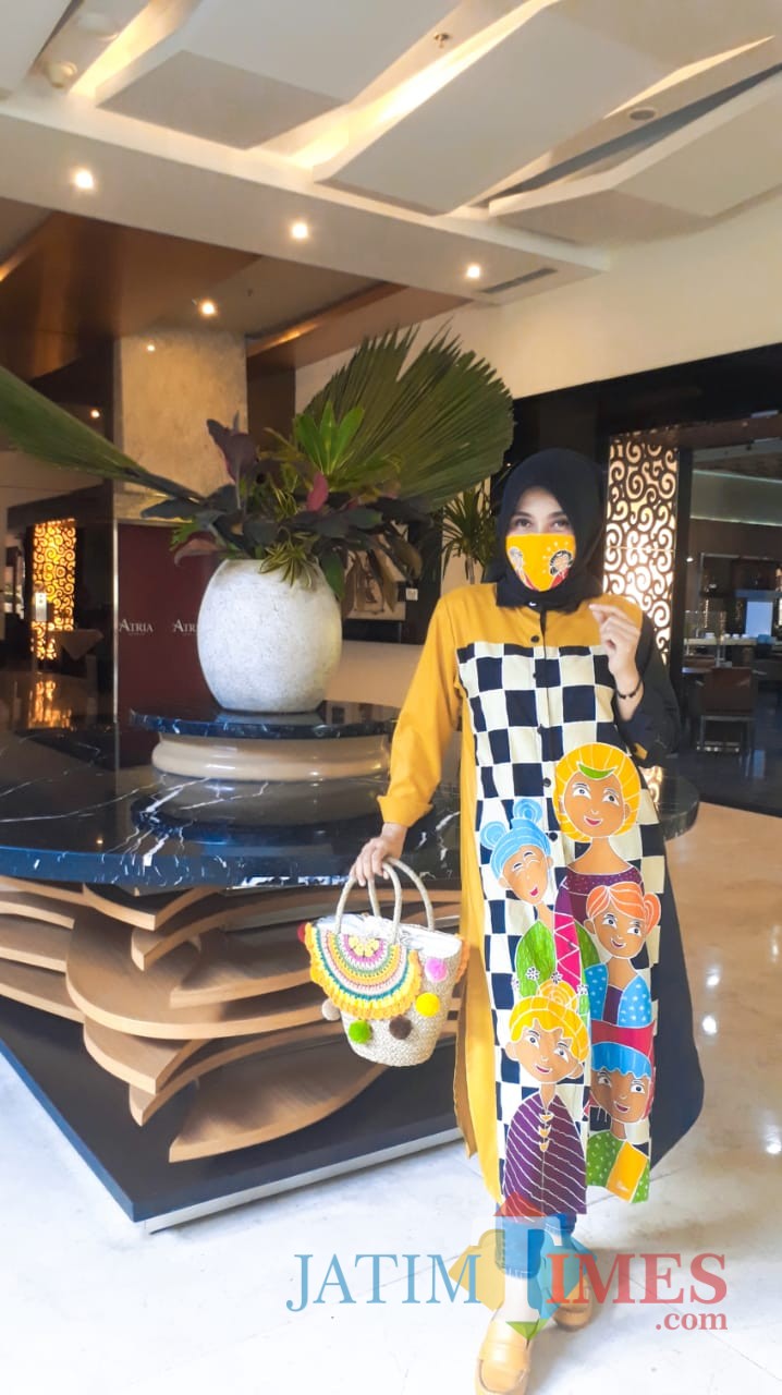 Owner Yaya Fashion Art mengenakan baju dan masker batik tulis yang fashionable (foto: Irin Iriyani to MalangTIMES)