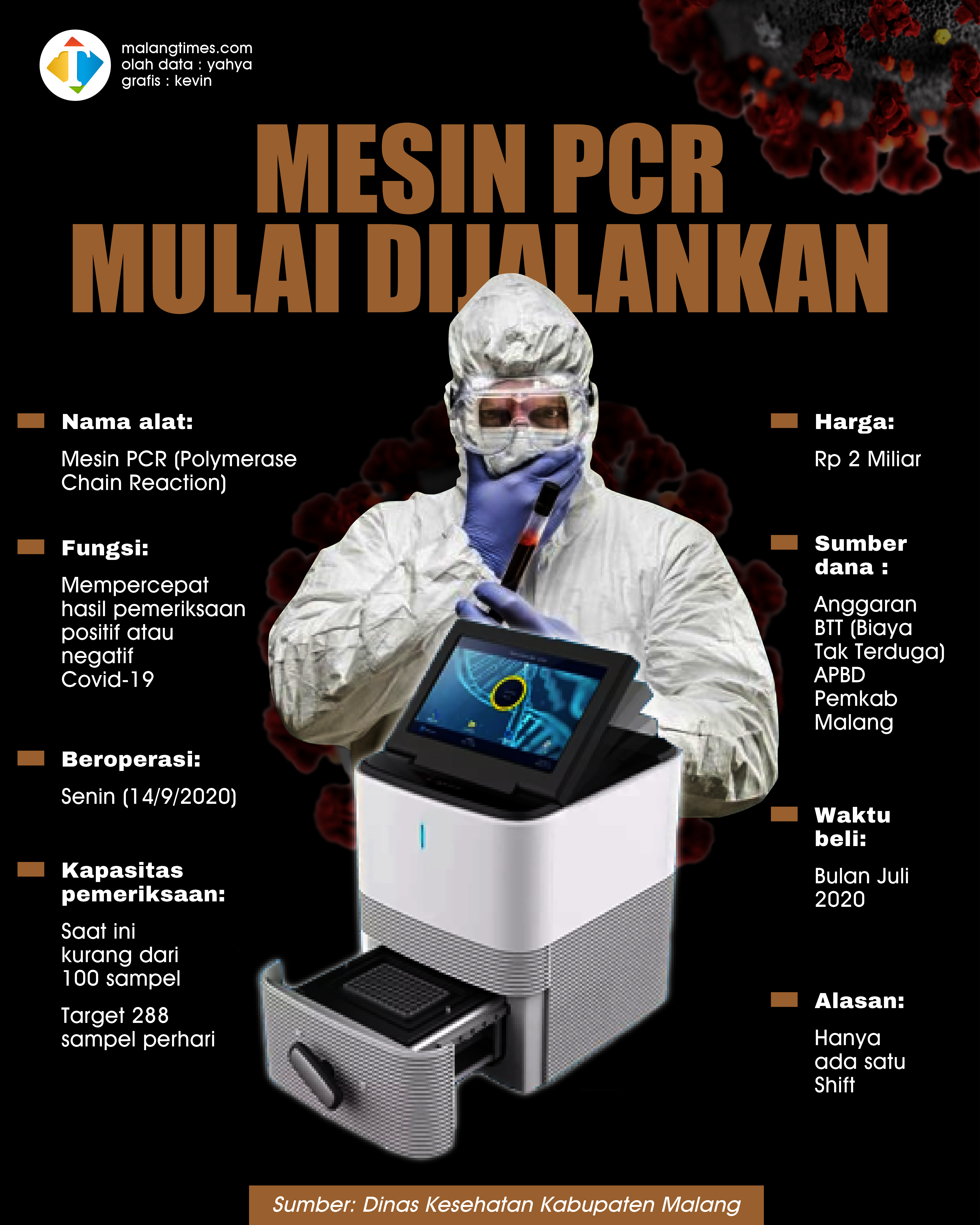 MALANGTIMES - Mesin PCR (Polymerase Chain Reaction) yang dibeli Pemerintah Kabupaten (Pemkab) Malang dua bulan lalu, akhirnya sudah bisa dimanfaatkan. Paeralatan yang dibeli menggunakan anggaran BTT (Biaya Tak Terduga) sebesar Rp 2 miliar itu, terhitung sejak Senin (14/9/2020) sudah dioperasikan oleh RSUD Kanjuruhan.