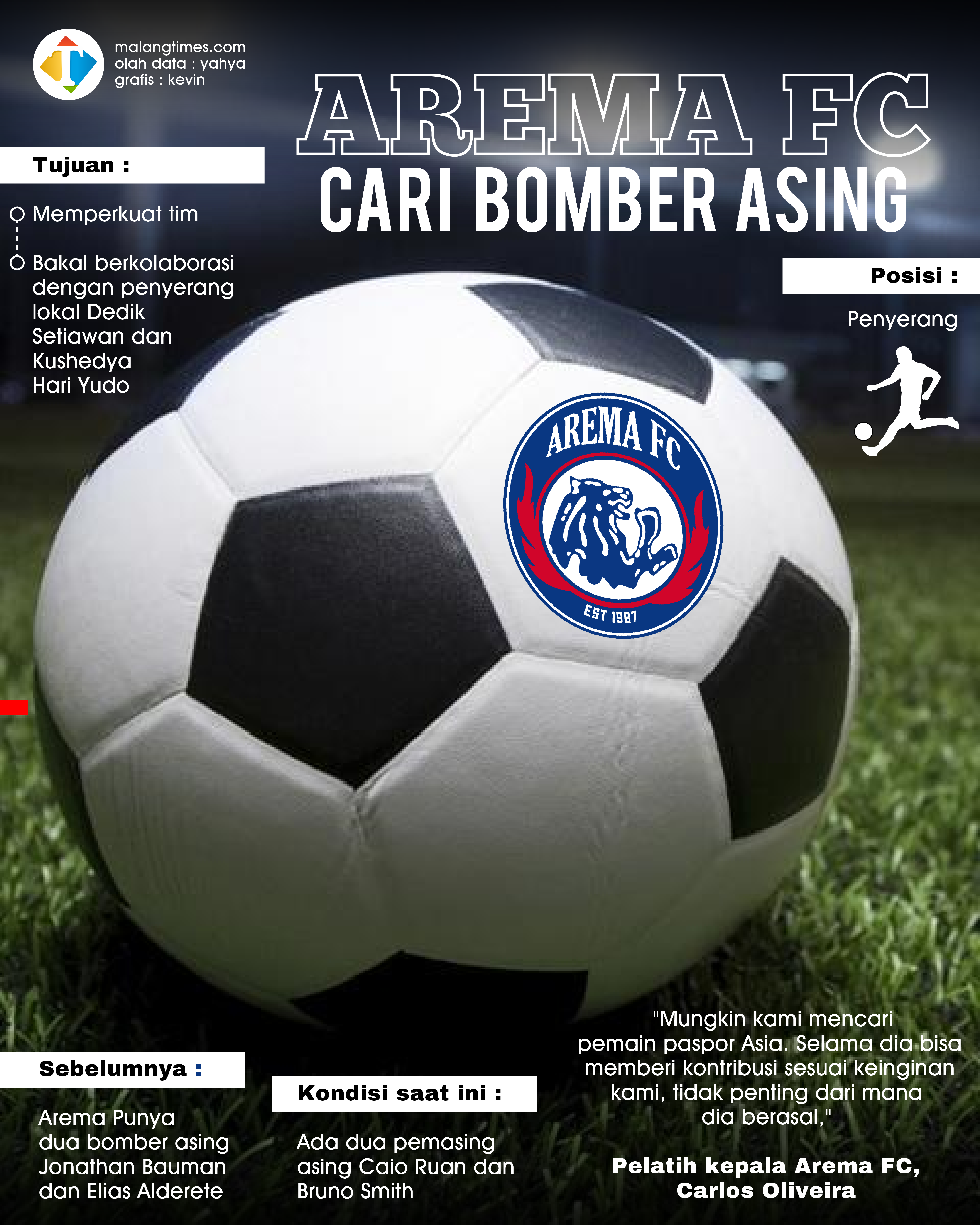 Arema FC nampaknya masih membutuhkan tambahan amunisi pemain terutama untuk lini depan. Hingga saat ini, Singo Edan tercatat tidak memiliki bomber asing selepas kepergian Jonathan Bauman dan Elias Alderete.