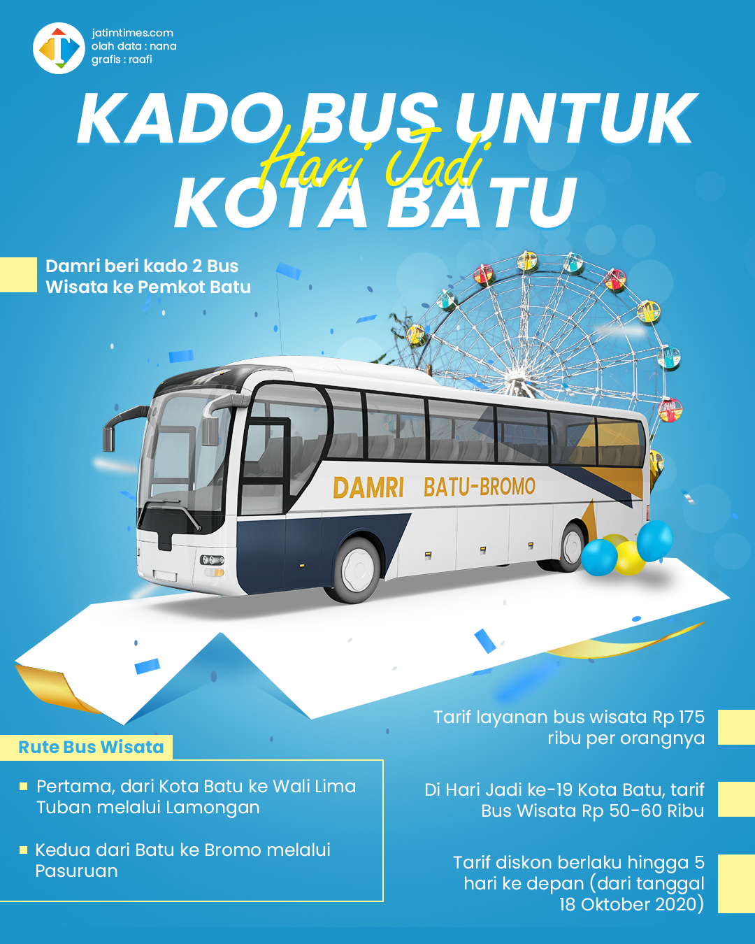 MALANGTIMES - Hari Jadi ke-19 Kota Batu diwarnai dengan kegembiraan. Misalnya, dengan adanya kado spesial yang diberikan Djawatan Angkoetan Motor Repoeblik Indonesia (DAMRI) ke Pemerintah Kota (Pemkot) Batu. Yakni, dua bus yang akan melayani jalur wisata Batu-Bromo.