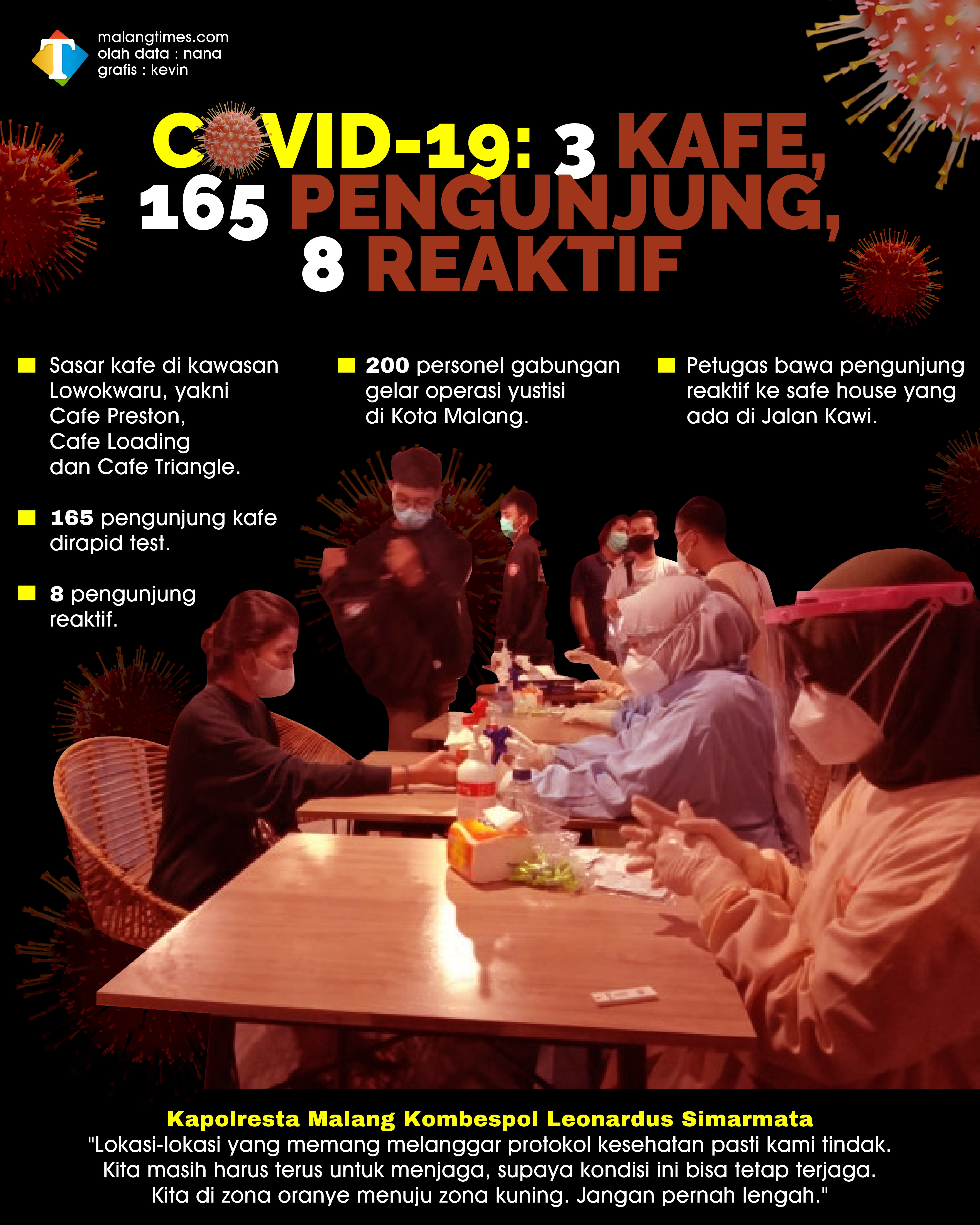 Kapolresta Malang Kota Kombespol Leonardus Simarmata, menjelaskan, setelah diketahui adanya pengunjung kafe yang reaktif, pihaknya kemudian membawanya ke safe house yang ada di Jalan Kawi.