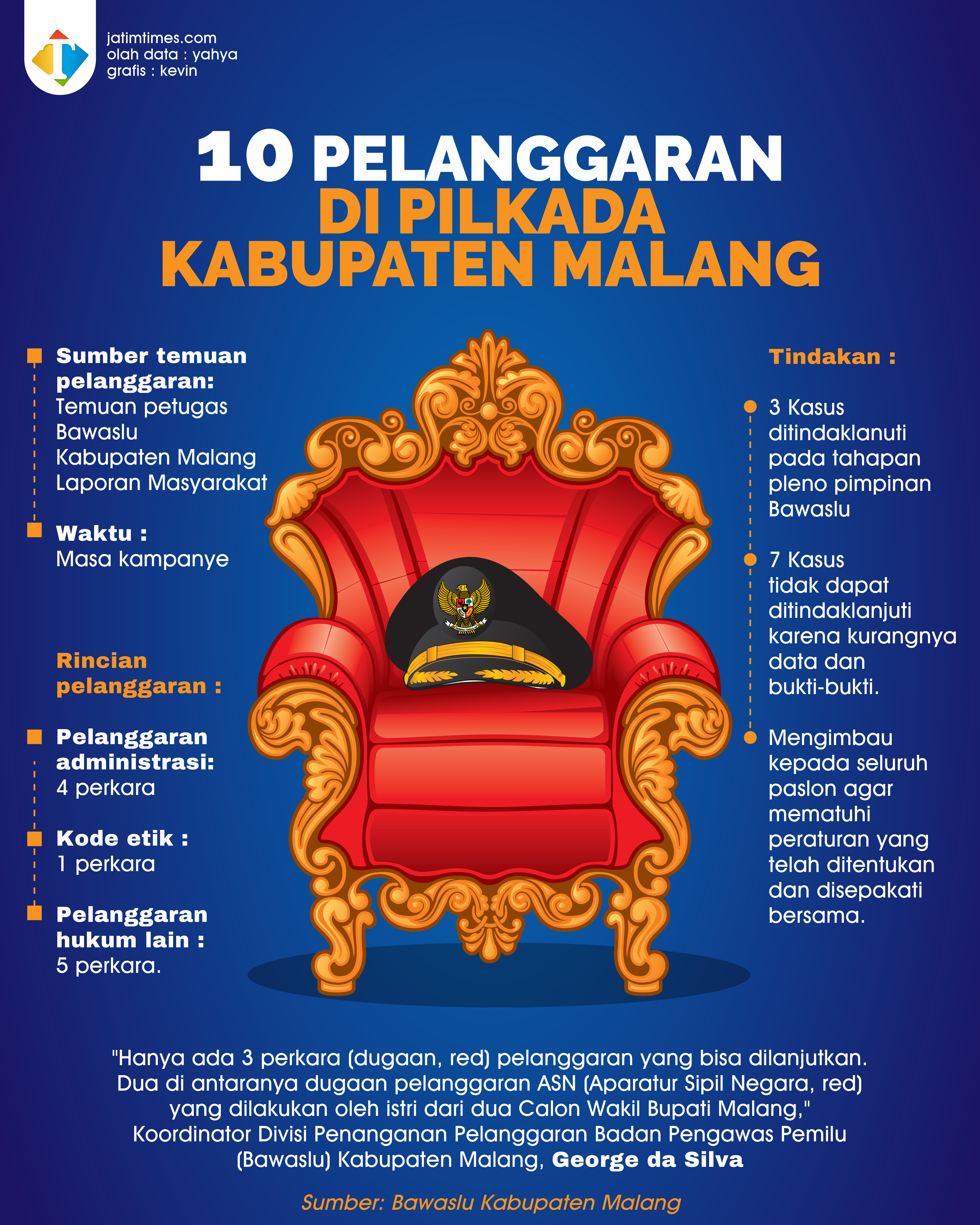 Koordinator Divisi Penanganan Pelanggaran Bawaslu Kabupaten Malang, George da Silva mengatakan bahwa dari 10 dugaan pelanggaran yang telah masuk di Bawaslu Kabupaten Malang berdasarkan temuan dan laporan dari masyarakat. "Total 10 (dugaan, red) pelanggaran itu diantaranya hasil temuan kami sekaligus laporan dari masyarakat," ungkapnya ketika ditemui awak media di Kantor Bawaslu Kabupaten Malang.