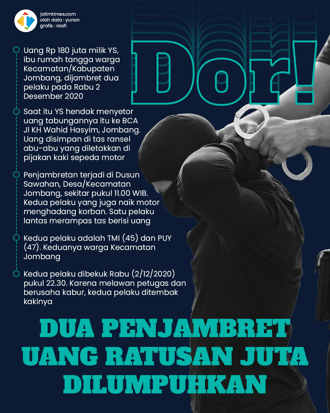 Mereka ditangkap setelah kedapatan menjambret uang Rp 180 juta milik seorang ibu rumah tangga warga Kecamatan Jombang, yakni YS (41), pada Rabu (2/12) kemarin. YS dijambret oleh kedua pelaku di Dusun Sawahan, Desa/Kecamatan Jombang, sekitar pukul 11.00 WIB.