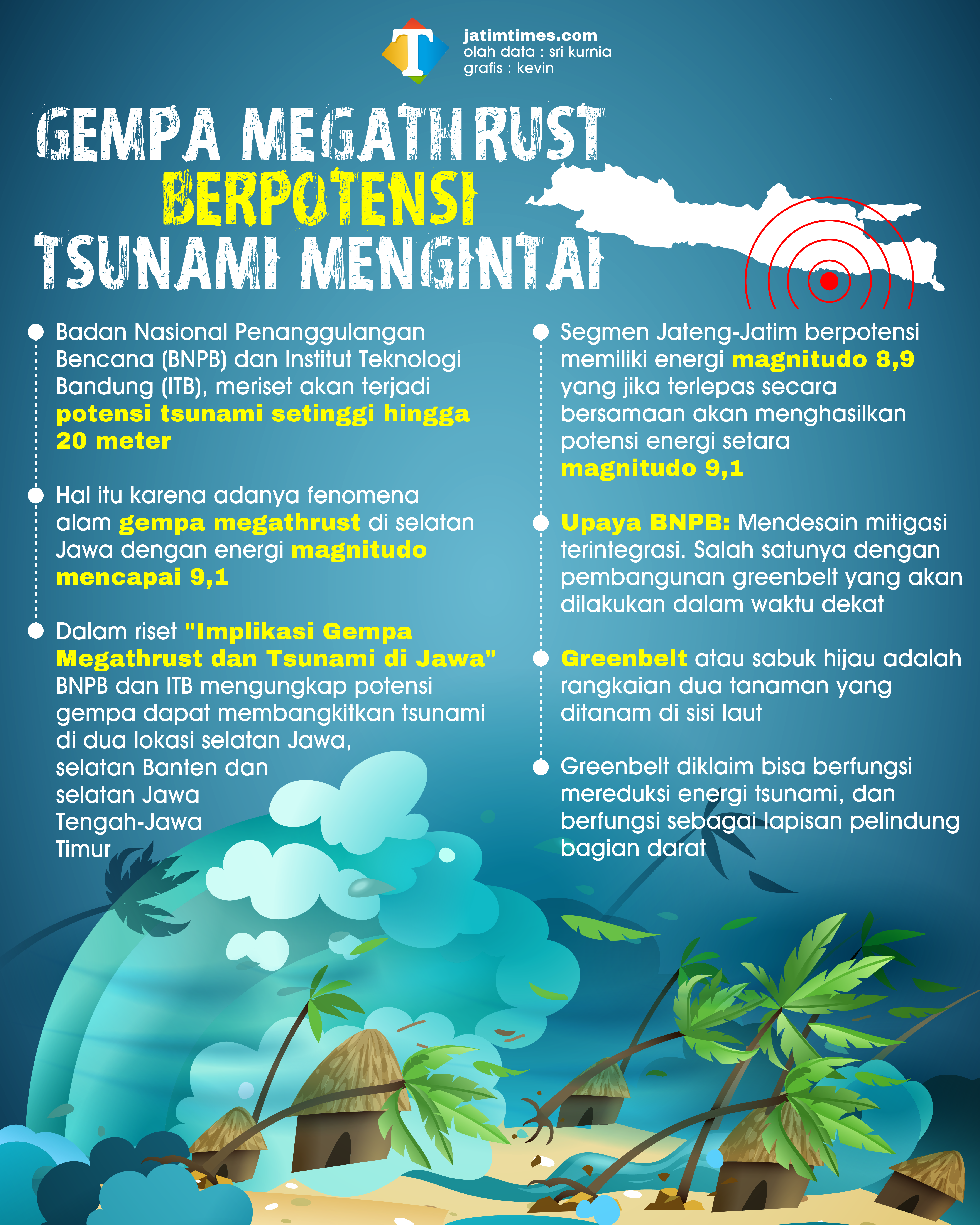 Hal ini dipicu oleh gempa megathrust selatan Jawa energi magnitudo mencapai 9,1. Potensi ini berdasarkan riset yang dilakukan BNPB bersama Institut Teknologi Bandung (ITB).