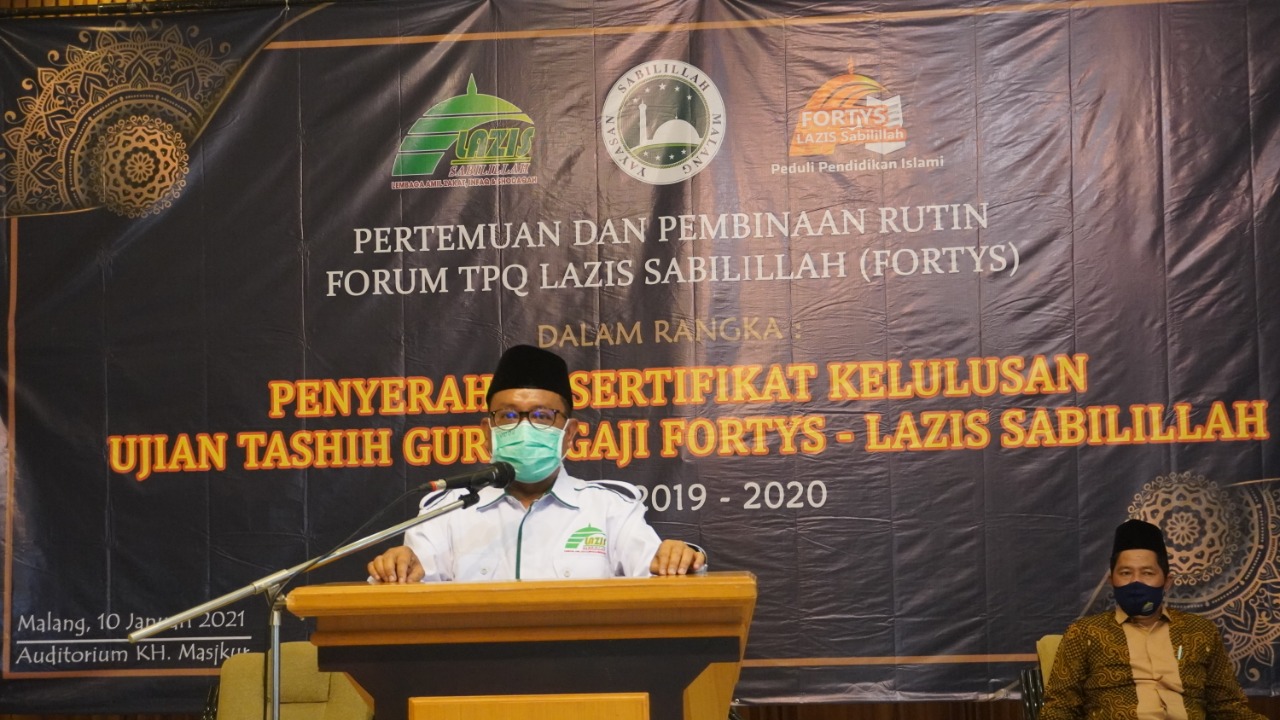 MALANGTIMES - Sebanyak 67 TPQ di Malang Raya diresmikan LAZIS Sabilillah. Peresmian yang dilangsungkan di Auditorium Kyai Masykur kompleks masjid Sabilillah pada Minggu (10/1/2021) tersebut ditandai dengan penyerahan sertifikat tashih bagi ustadz-ustadzah pengelola TPQ. Serta penyerahan plakat TPQ oleh Ketua Yayasan III Bidang Sosial, Ekonomi, Kemasyarakatan M Mas'ud Said.