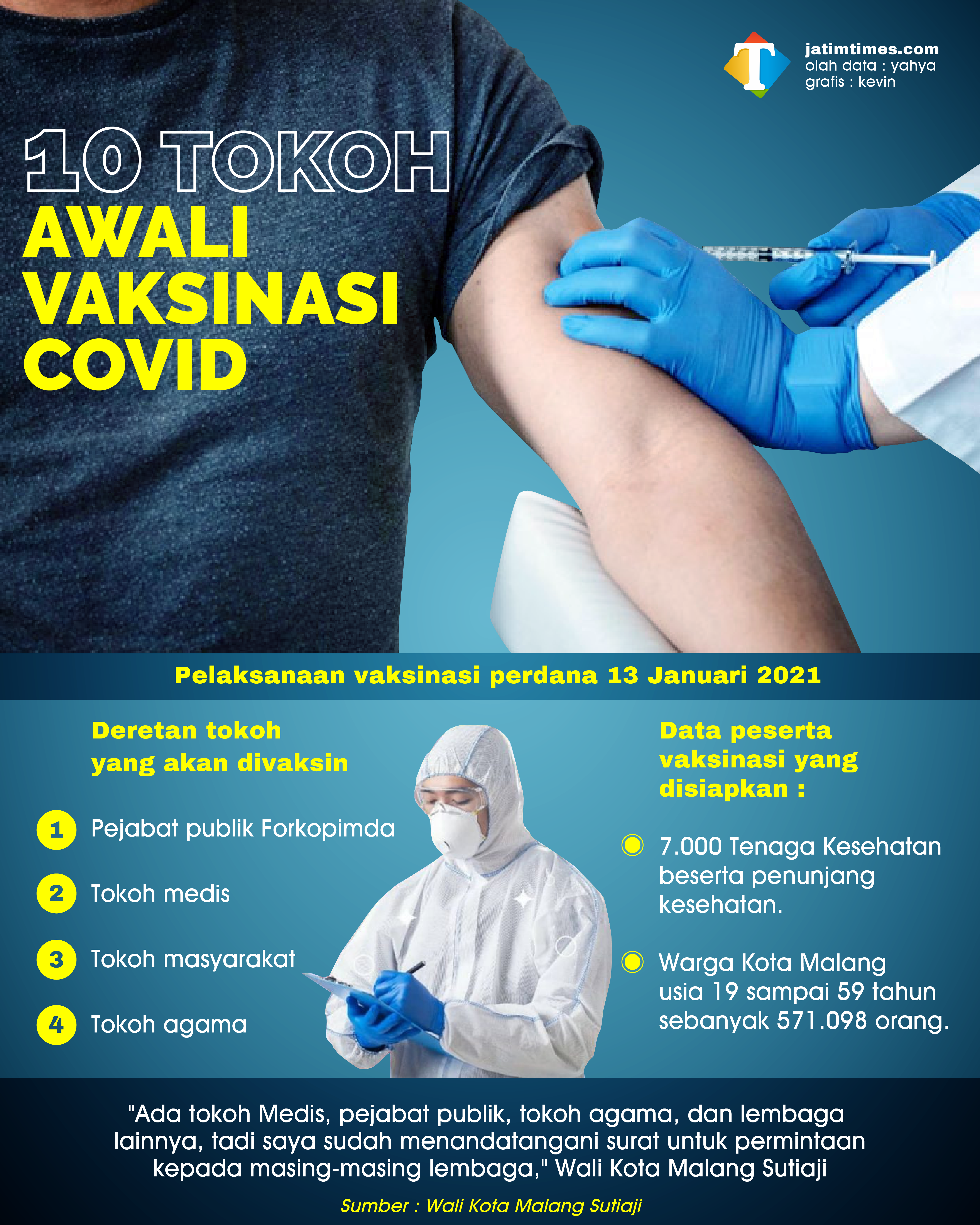 Wali Kota Malang Sutiaji menyatakan setidaknya nantinya akan ada 10 pejabat yang terdiri dari tokoh-tokoh masyarakat yang akan menjalani vaksinasi tahap awal tersebut.