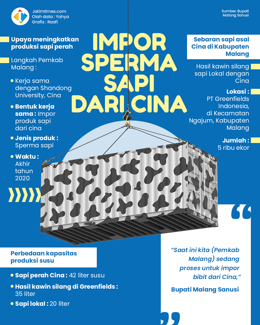 Seperti yang sudah diberitakan, MoU antara Pemkab Malang dengan Cina itu, mencuat sejak akhir tahun 2020 lalu. Saat itu Sanusi mengklaim telah menjalin kerja sama dengan Shandong University, Cina untuk meningkatkan produksi sapi perah.
