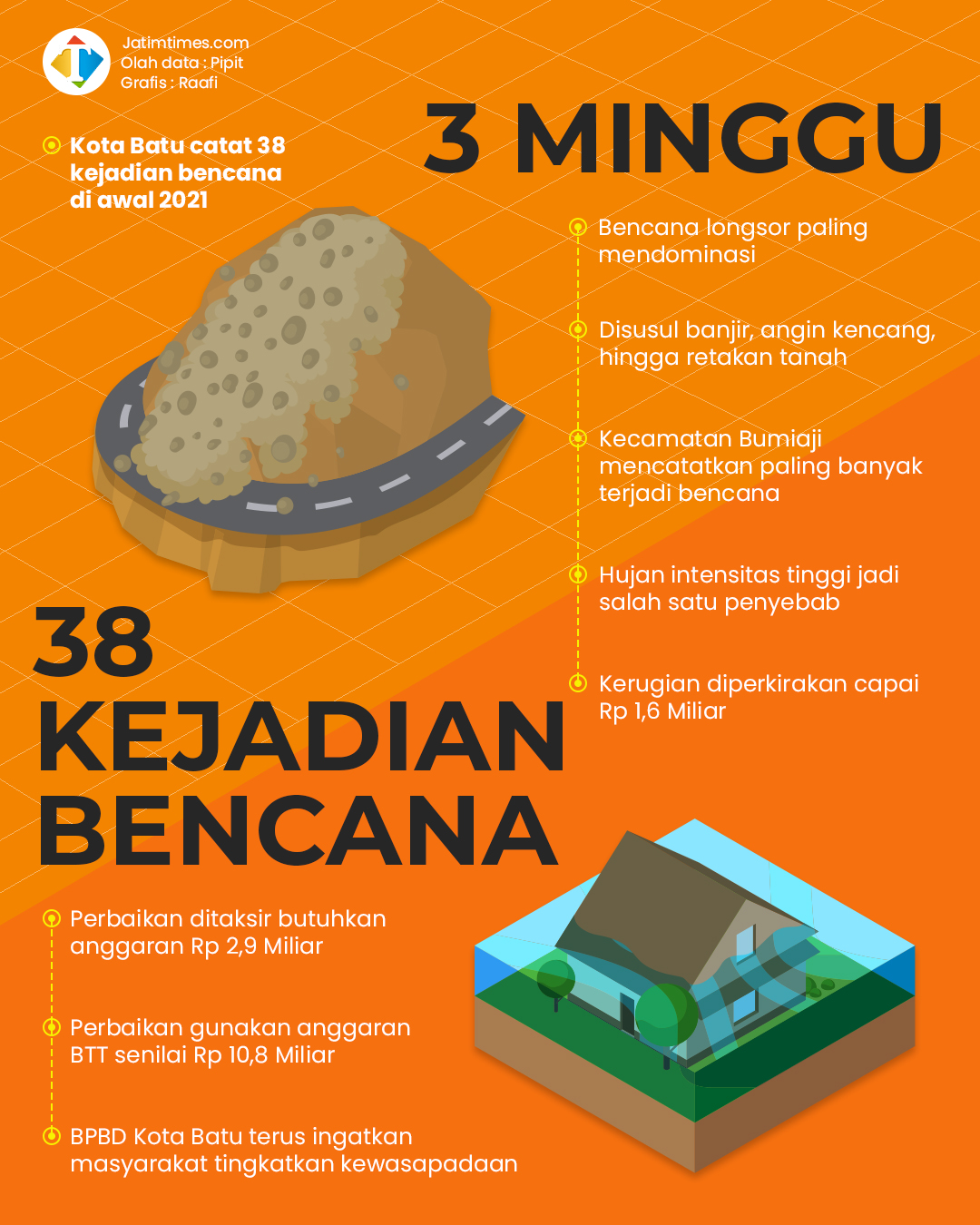 BATUTIMES - Masih awal Januari, angka bencana di Kota Batu mengalami kenaikan yang cukup signifikan. Hingga Kamis (21/1/2021), tercatat sudah ada 38 kejadian yang menyebabkan kerugian mencapai miliaran rupiah. Peristiwa bencana itupun didominasi tanah longsor.