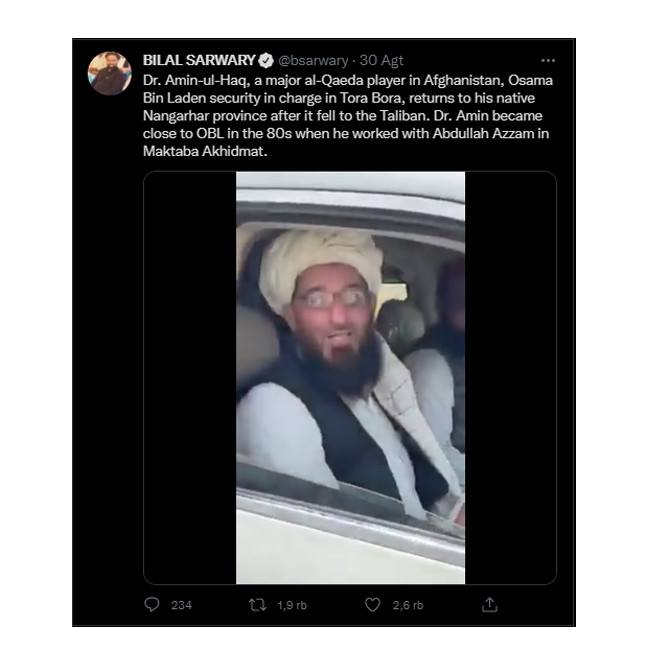 "Dr. Amin ul-Haq, pemain besar Al-Qaeda di Afghanistan, juga kepala keamanan Osma bin Laden di Tora Bora, kembali ke kampung halamannya di Provinsi Nangarhar, setelah daerah itu dikuasai Taliban," tulis Sarwary di Twitter.