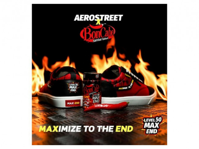 Siapa yang suka makan pedas? Tentu saja tak asing dengan produk Boncabe. Ya, Aerostreet merilis disain sepatu berkolaborasi dengan produk bubuk cabe tabur yang sangat terkenal di Indonesia ini.
